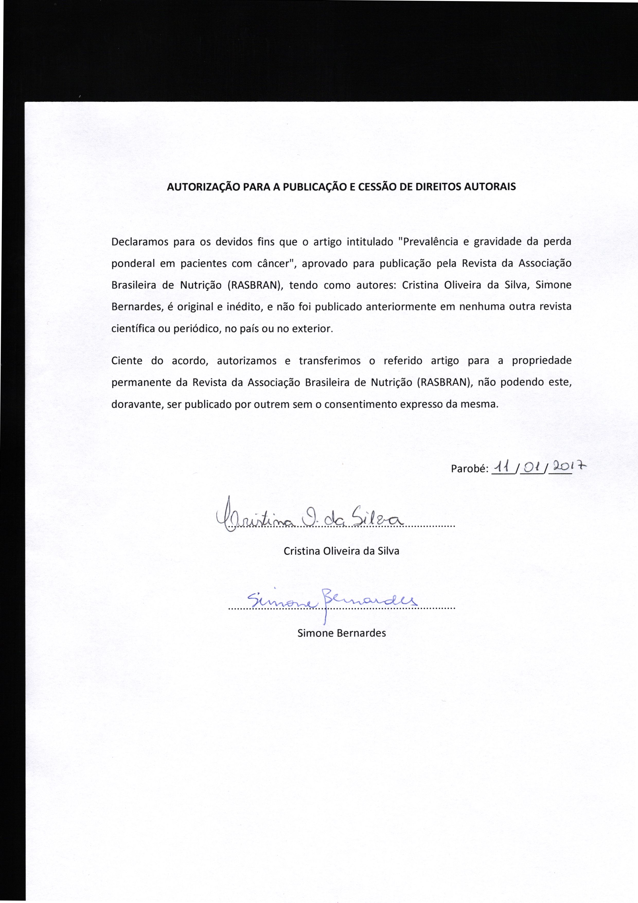 Ao encaminhar os originais, os autores cedem os direitos de primeira publicação para a Revista da Associação Brasileira de Nutrição e aceitam que seu trabalho seja publicado de acordo com nossa Declaração de Direito Autoral.