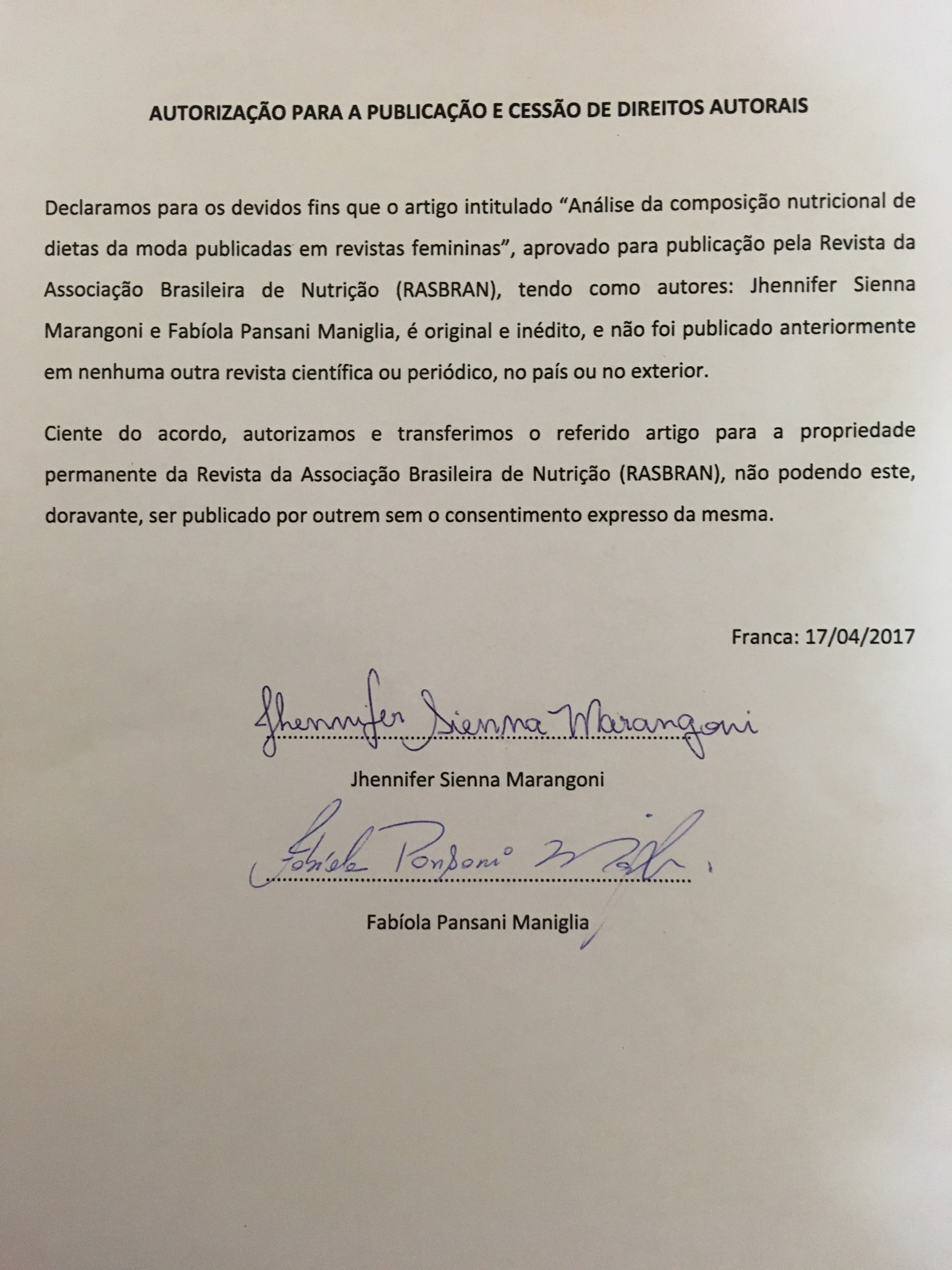 Ao encaminhar os originais, os autores cedem os direitos de primeira publicação para a Revista da Associação Brasileira de Nutrição e aceitam que seu trabalho seja publicado de acordo com nossa Declaração de Direito Autoral.
